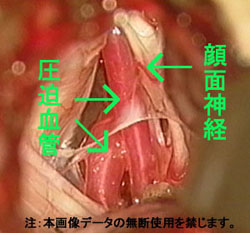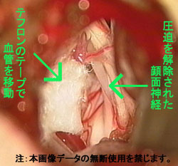 私の場合、顔面神経を圧迫していた血管は実際には3本もあったそうです。(普通1〜2本だそうで、A図ではそのうちの2本が確認できます。)手術は、この圧迫血管を剥離して移動し、顔面神経にたいする圧迫をとりのぞくそうです。これは「血管移動法」と呼ばれる手法で、具体的にはB図のように、テフロンのテープで血管を移動し、固定時には自己血採血に採取した私の血液からオリジナルの糊を作り使用しているとのことでした。